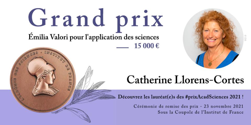 The Grand Prix Émilia Valori for the application of science 2021 is awarded to Catherine Llorens-Cortes, neuropharmacologist, Inserm research director at the Centre interdisciplinaire de recherche en biologie (CIRB) of the Collège de France and appointed member of the European Academy of Sciences in 2021.