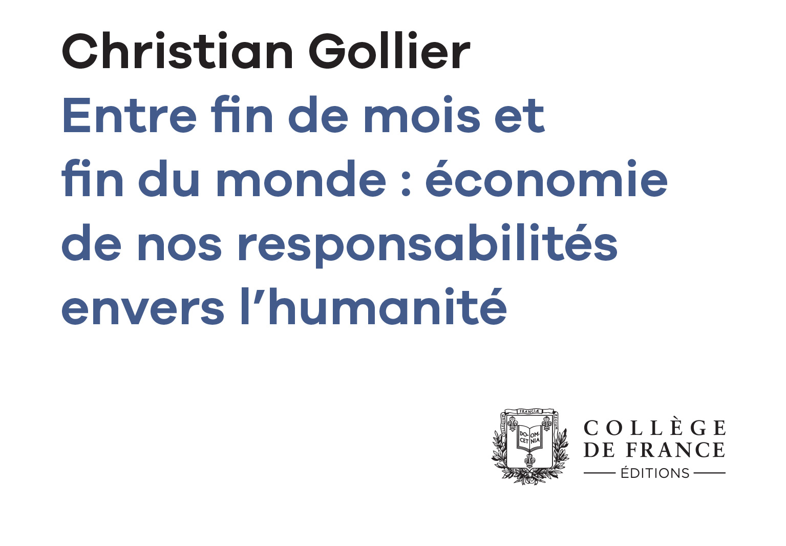 Gollier C., Entre fin de mois et fin du monde : économie de nos responsabilités envers l'humanité, Paris, Collège de France/Fayard, coll. " Leçons inaugurales ",no 306, 2022.