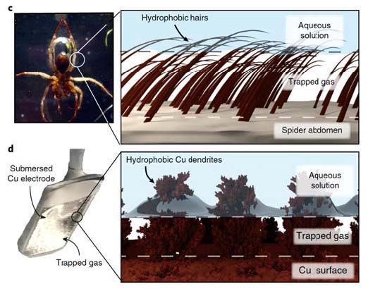 Faceplate effect. Use of a hydrophobic surface to trap a layer of gas at the solution-solid interface. This is illustrated by the underwater respiration of a diving spider (top left) and a hydrophobic dendritic copper surface acting as a catalyst for the electroreduction of aqueousCO2 (bottom right). The spider photo is adapted from Seymour and Hetz, with permission from The Company of Biologists Foundation.