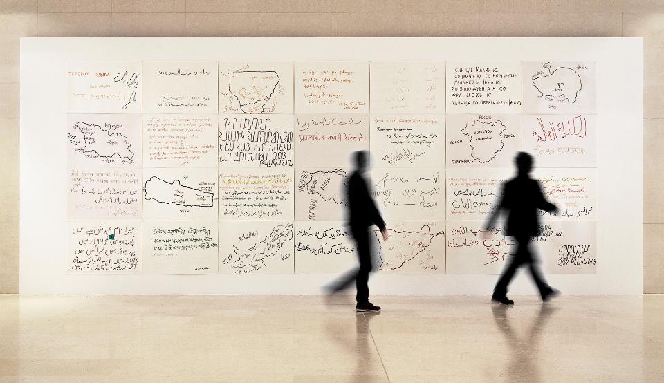 Le Point de départ is a work created with a group of migrants as part of a writing workshop run in collaboration with the association Français Langue d'Accueil. Mathieu Pernot gave the group large drawing sheets on which to write a text introducing themselves in their native language. Participants accompanied their text with a drawing illustrating the map of the regions and countries from which they come (Nepal, Chechnya, Tibet, Afghanistan, Pakistan, Sudan, Georgia and Armenia). They also talk about the difficulties of learning a new language and arriving in an unfamiliar country. These multilingual, colorful, hand-drawn texts can be seen as the beginnings of a narrative that gradually takes shape with the artist. Le Point de départ is the first presentation of Mathieu Pernot's work during his artist residency at the Collège de France.