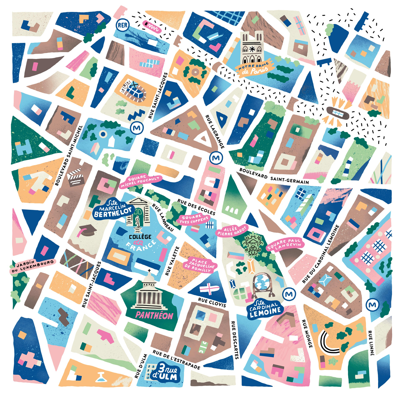 The three sites of the establishment (main site Marcelin-Berthelot, receiving auditors ; site Cardinal-Lemoine housing the Institut des Civilisations ; site Ulm) are indicated, as well as nearby public spaces bearing the names of illustrious professors of the Collège de France.
