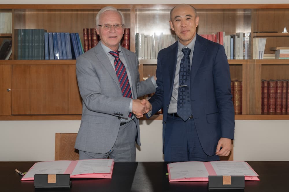Thomas Römer, administrateur du Collège de France, et Takeo Hoshi, directeur du Tokyo College de l'université de Tokyo, ont signé ce jeudi 13 juin 2024 un nouvel accord de partenariat entre les deux institutions, d'une durée de cinq ans, prolongeant celui en vigueur depuis 2019.