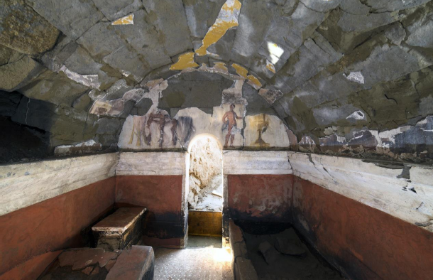 Les fouilles archéologiques de Cumes dirigées par Jean-Pierre Brun (Collège de France) et Priscilla Munzi (Centre Jean Bérard, USR 3133 CNRS - École française de Rome), avec le soutien financier du Ministère de l’Europe et des Affaires étrangères (Commission des fouilles) et de l’École française de Rome ont mis au jour une tombe à chambre des IIIe-IIe siècles avant J.-C. ornée de peintures.