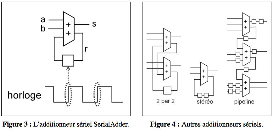 Le remarquable travail de Jean Vuillemin [2] établit les rapports entre les 2-adiques et les circuits. Les points essentiels sont résumés dans la figure 5. D’abord, le circuit FullAdder trouve en 2-adiques une définition bien plus intéressante que sa définition purement combinatoire de la figure 1. Si on note a, b, c, s,r, les suites d’entrées et sorties de l’additionneur au cours du temps vues comme 2-adiques, alors FullAdder vérifie l’invariant 2-adique a + b + c = s + 2r, qui remplace avantageusement le calcul booléen par le calcul numérique. Le second point est qu’un registre est un multiplieur par 2 pour les 2-adiques, puisqu’il sort un 0 initial puis les bits d’entrée retardés. Si on rajoute une négation booléenne de chaque côté du registre, représentée par un cercle, le « registre à oreilles » obtenu calcule 1+2x pour l’entrée x.